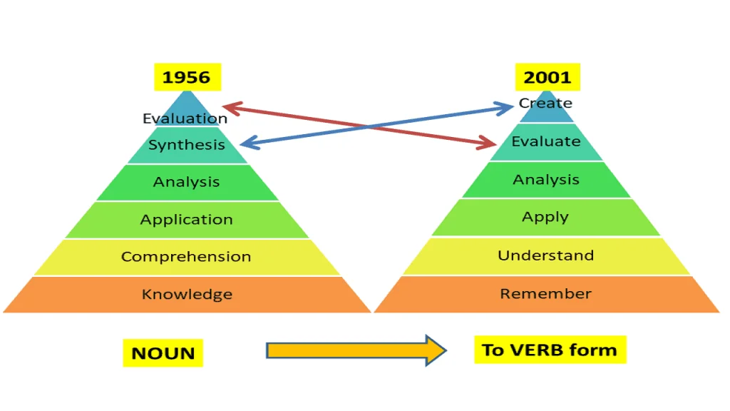 The levels were renamed from nouns to gerunds—Remembering, Understanding, Applying, Analyzing, Evaluating, and Creating—emphasizing learning as an active process. This shift aligned with student-centered pedagogies, focusing on what learners do. For example, “Knowledge” became “Remembering” (e.g., recalling key dates), and “Comprehension” became “Understanding” (e.g., explaining a concept), making objectives more actionable. - Reordering the Hierarchy: Elevating Creativity